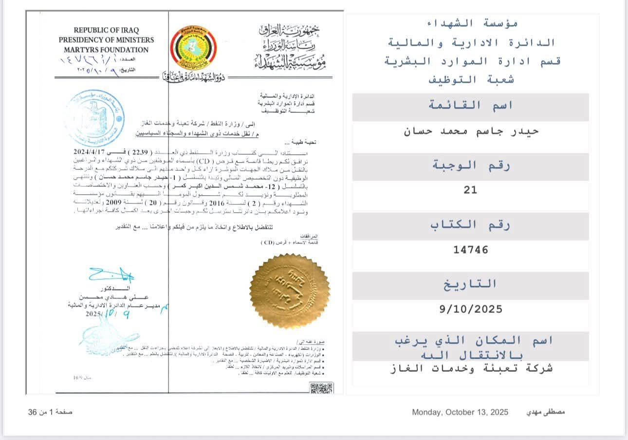 مؤسسة الشهداء تُنجز الوجبة الحادية والعشرين من طلبات نقل ذوي الشهداء إلى وزارة النفط