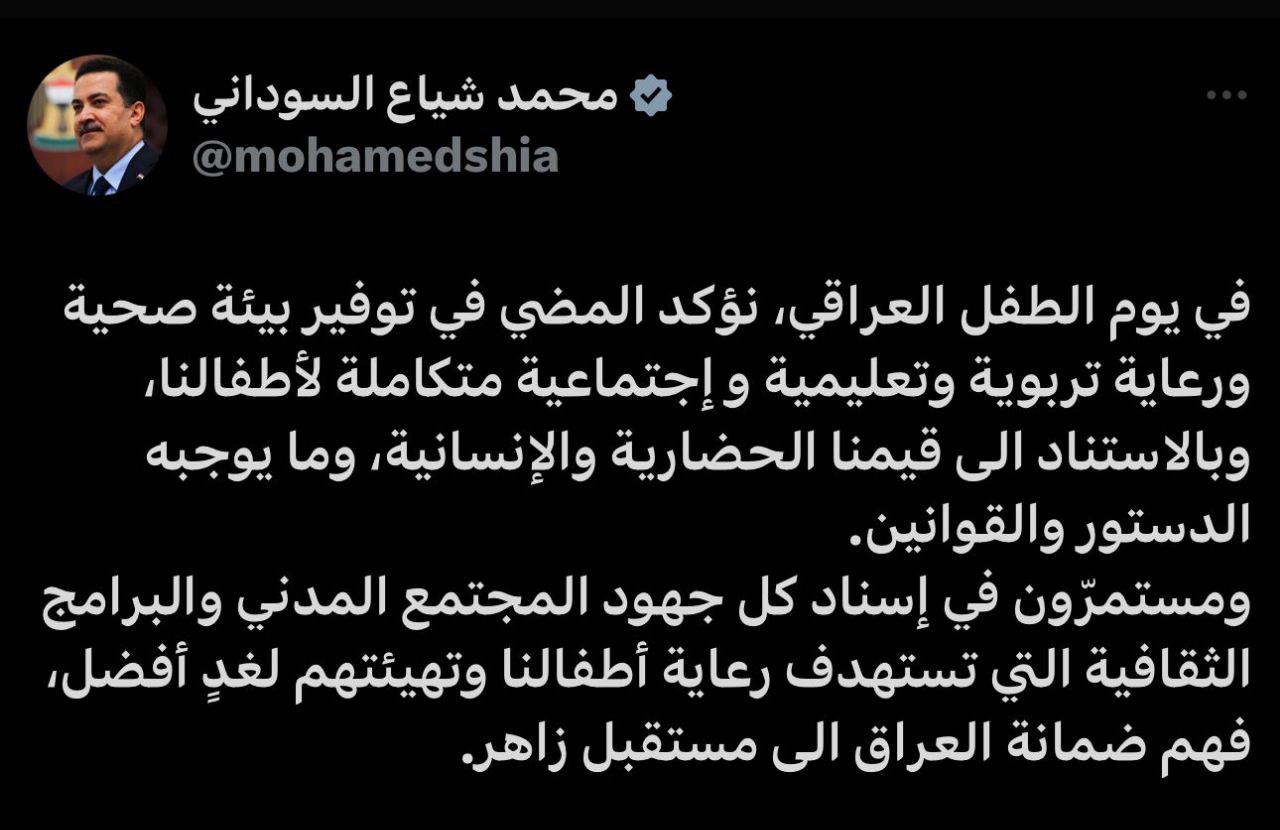 رئيس الوزراء: في يوم الطفل العراقي نؤكد المضي في توفير بيئة صحية ورعاية تربوية وتعليمية واجتماعية متكاملة لأطفالنا