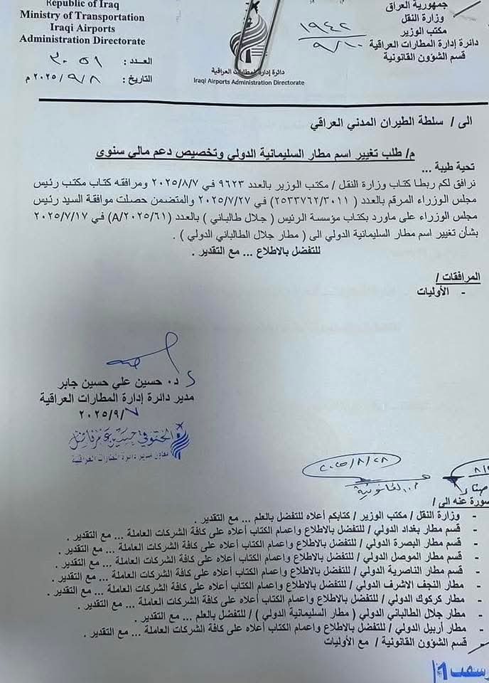 بالوثيقة: الموافقة على تغيير اسم مطار السليمانية إلى مطار جلال الطالباني الدولي