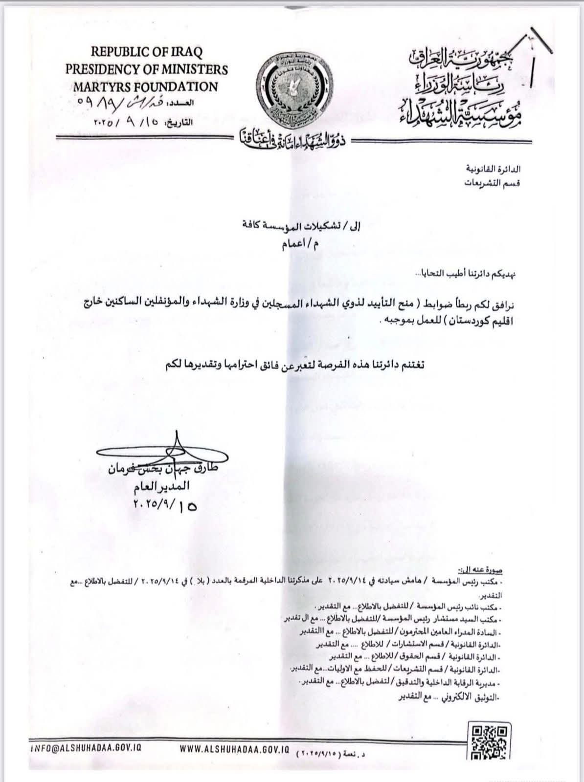 بالوثيقة : بمتابعة د. شاخوان عبدالله.. مؤسسة الشهداء تباشر تعديل القانون لشمول كركوك والمناطق خارج الإقليم بالامتيازات